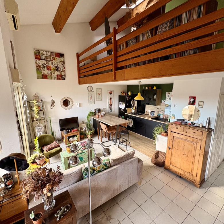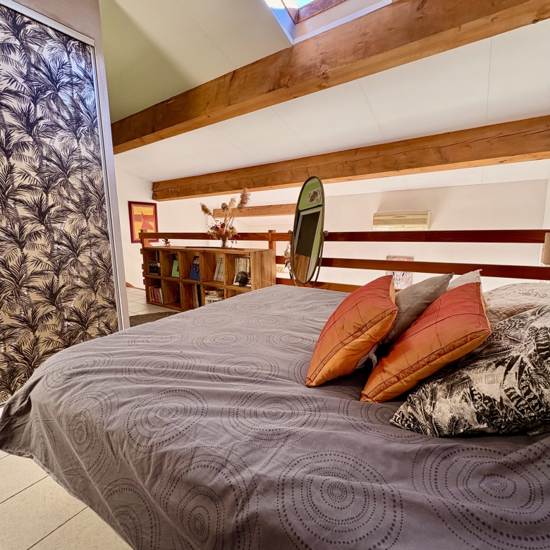 À l’étage, vous trouverez une superbe mezzanine aménagée en chambre spacieuse, équipée d’un Velux apportant une luminosité naturelle optimale.